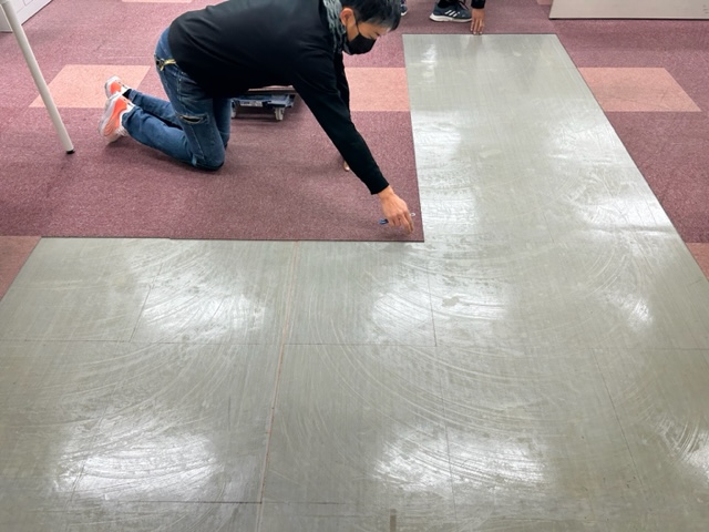 既存のタイルカーペットを撤去し、新しいカーペットを一枚ずつ丁寧に施工。