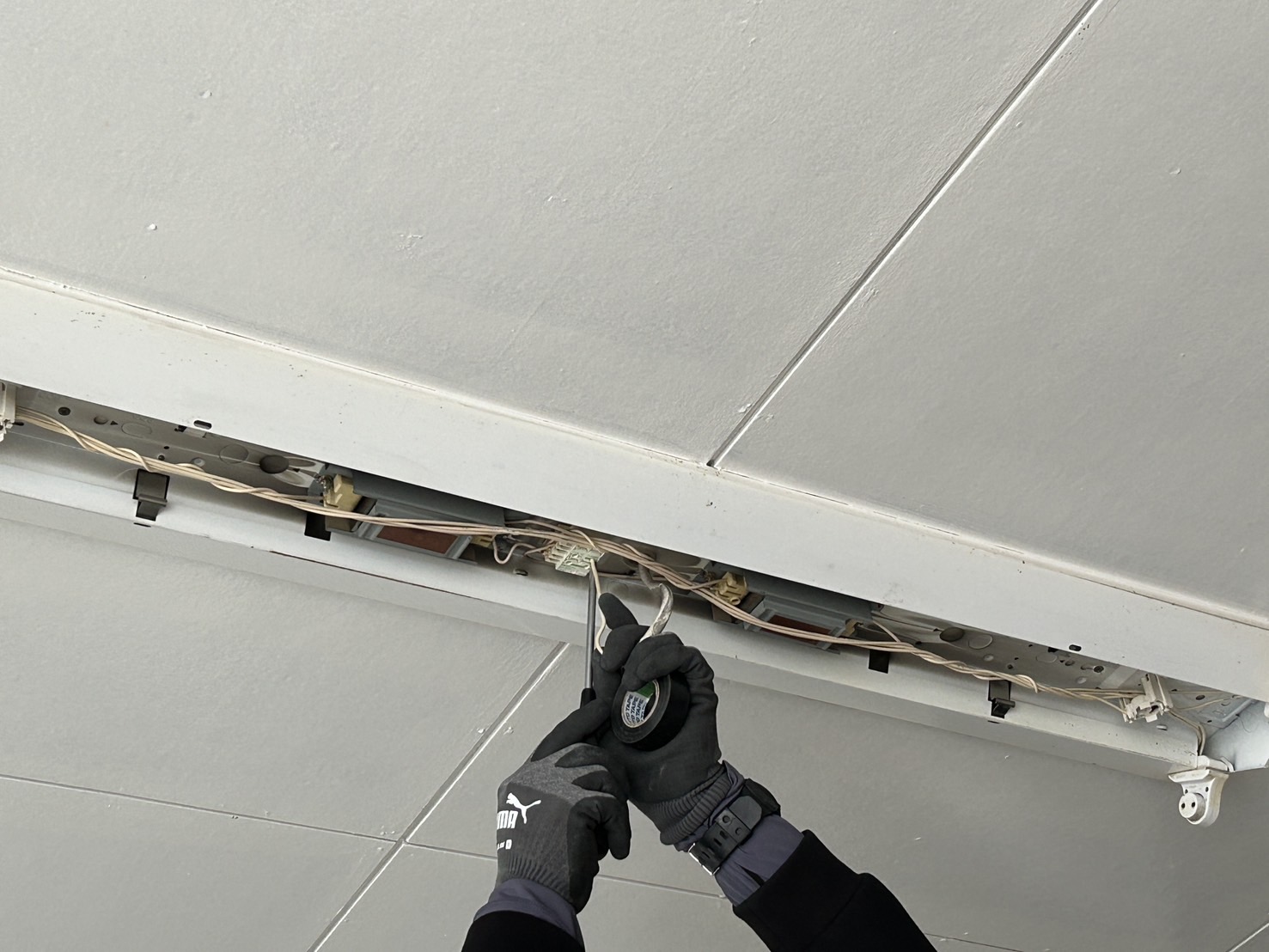 天井内の配線を確認しながら、既存の蛍光灯器具を慎重に取り外していきます。