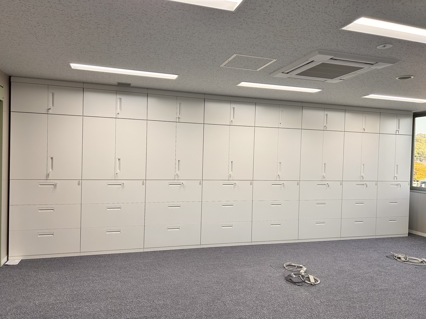 壁一面を活用した大容量収納で、安全性と美しさを両立したオフィス空間へ