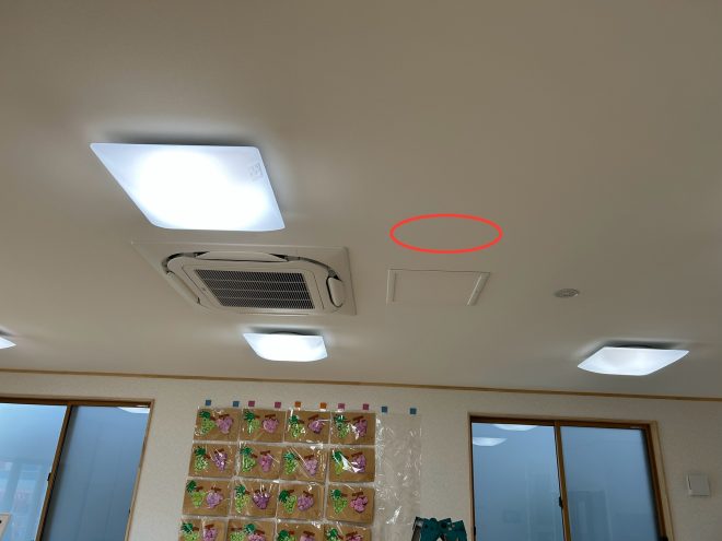 新館の天井へスピーカー設置位置を決定し、開口作業を行いました。