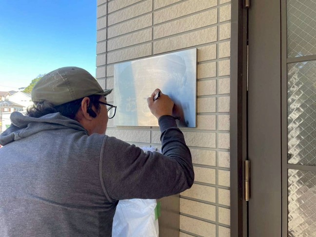 下地を傷つけないよう細心の注意を払いながら作業を行い、新たな表示のための下準備を進めます。