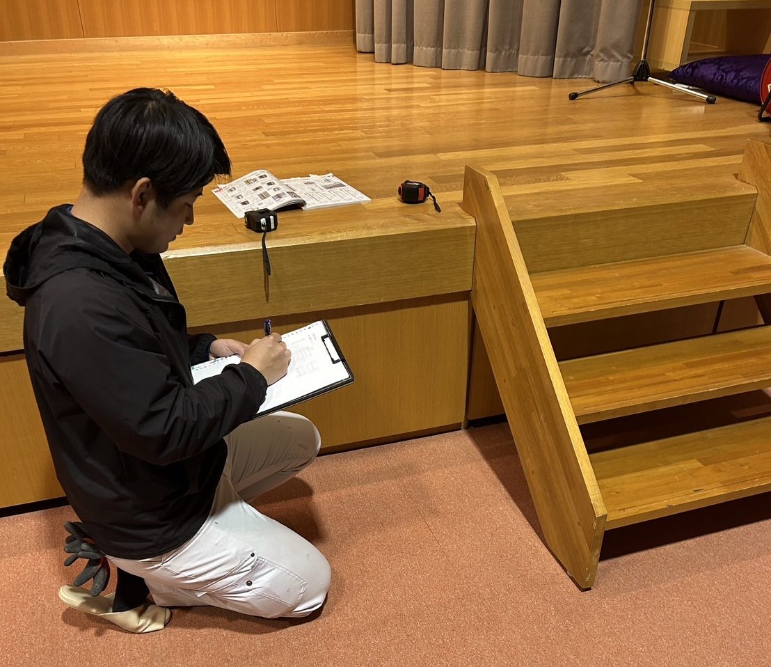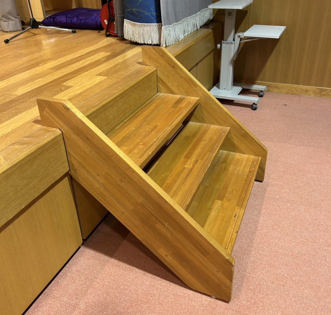 寺院内のステージへ上がる階段について、「高齢の参拝者や行事参加者が安全に昇降できるようにしたい」とのご相談をいただきました。