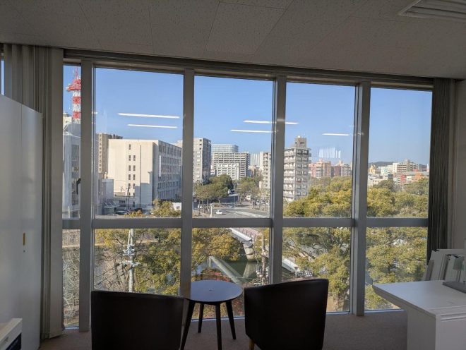 大きな窓から自然光がたっぷり入る明るいオフィス空間。