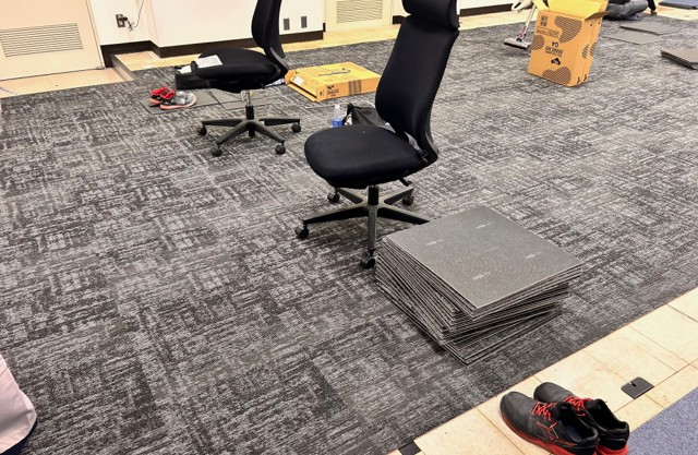 既存の床材を撤去し、新しいタイルカーペットを一枚ずつ丁寧に貼り替えていきます。