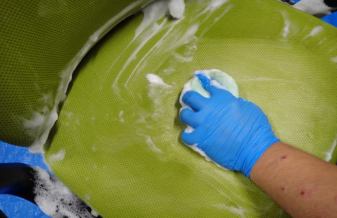 まずは専用の洗剤とスポンジを使って、手作業で丁寧に洗浄していきます。