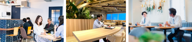 下記のような工夫でONとOFFを切り替えられ、業務中の同僚に気を遣うことなくリラックスして利用できる食堂になります。
