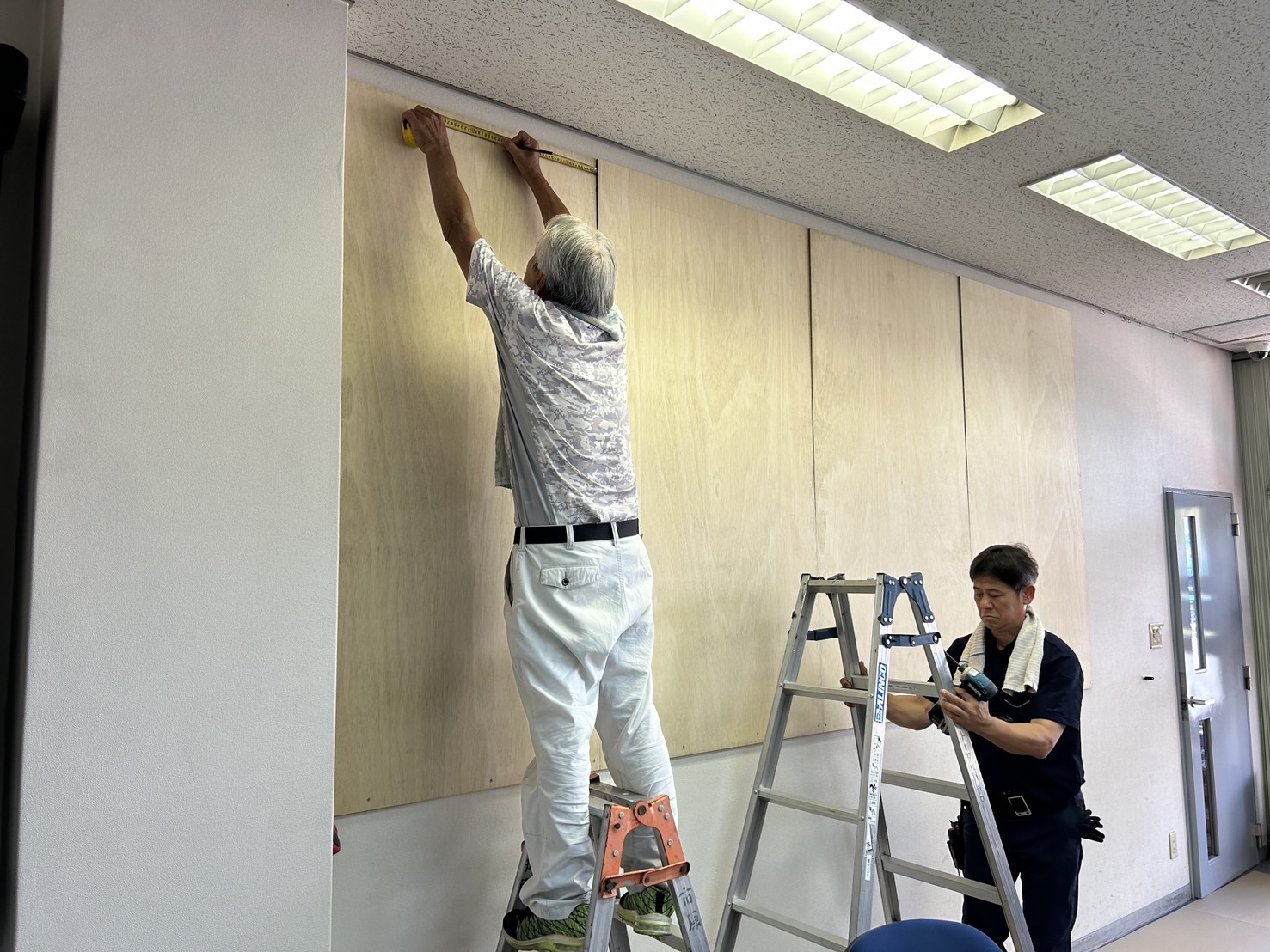 新しい下地としてスリット入りの大きな合板を丁寧に設置していきます。
