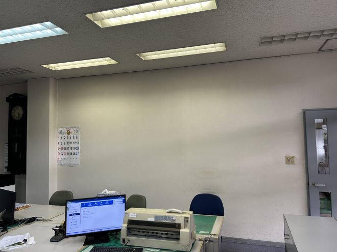 元々は展示用ではなく、事務所として長年使用されていたため、壁面自体にくすみや傷が目立っていました。こちらの空間を有効活用するべく、ディスプレイできる壁面に貼り替えていきます。