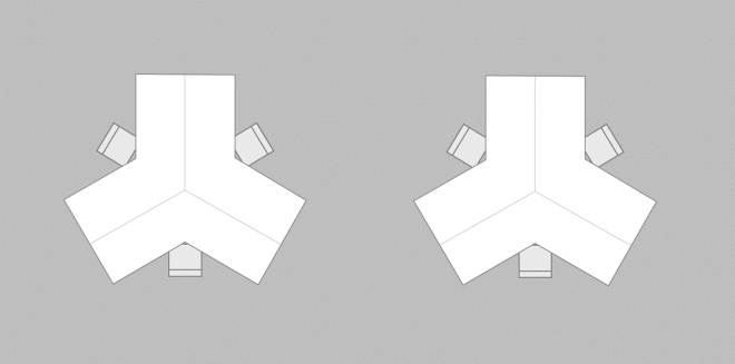 120度の角度がついたデスクを3台組み合わせて島を作る形式です。 1人あたりの作業領域が広く確保できるため、図面や資料を広げる設計・経理部門や、複数のモニターを使用する開発部門などに適しています。