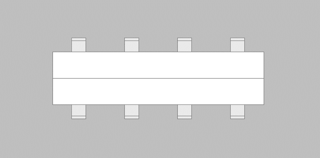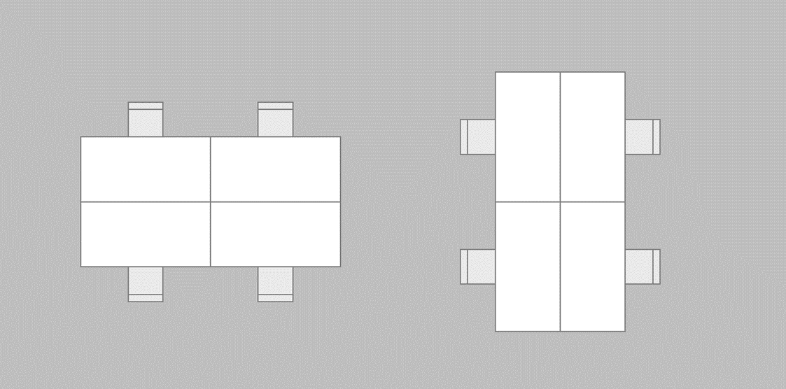 同一部署の社員同士が背中合わせに着席する配置形式です。 視線が合わないため業務に集中しやすい環境を作ることができます。 後方を振り返ればすぐに会話ができるため、集中とコミュニケーションのバランスに優れたレイアウトと言えます。 スペースに余裕がある場合、中央にミーティングテーブルを設置することで打ち合わせの効率がさらに向上します。
