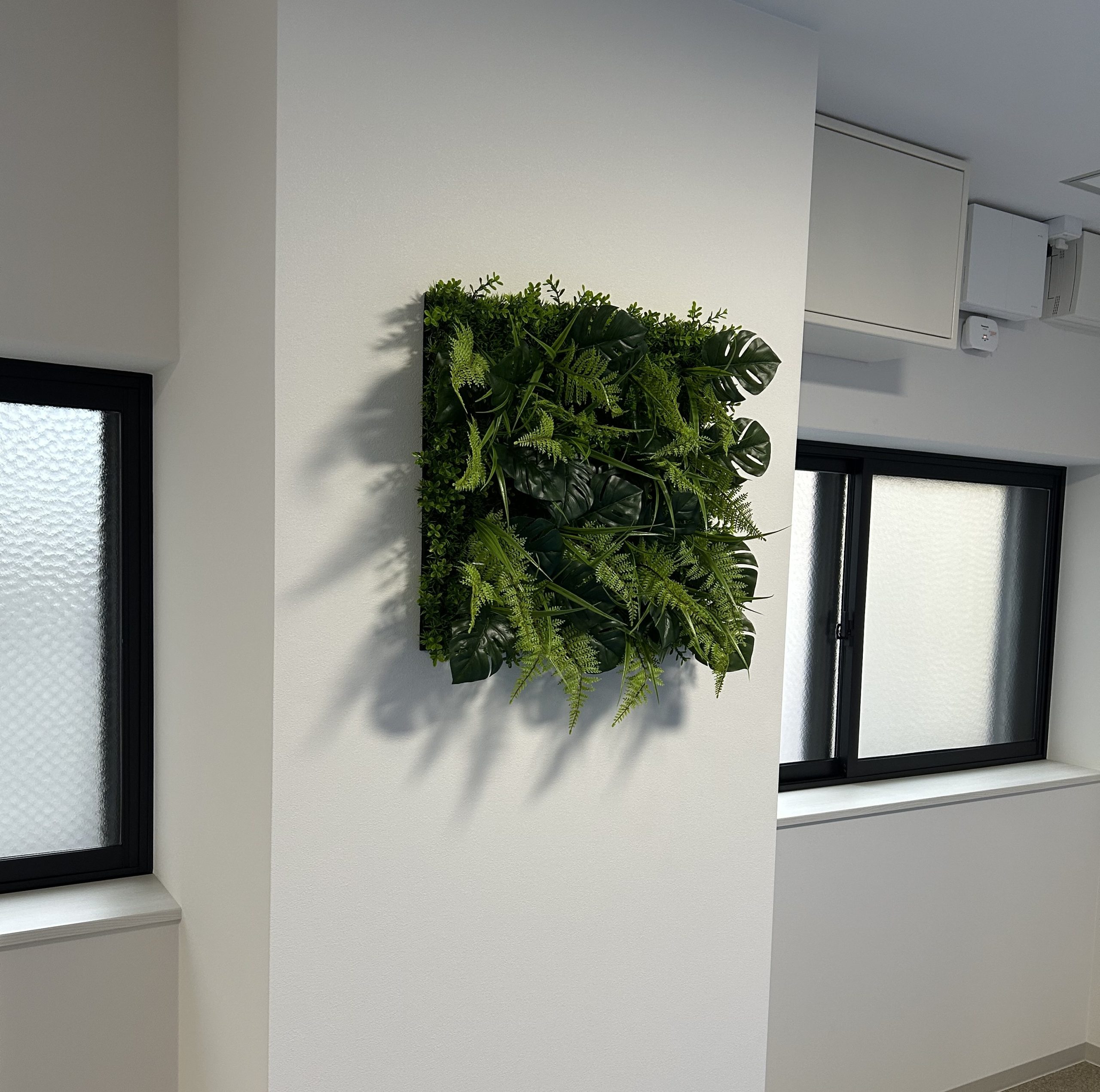 空間のアクセントと雰囲気づくりを目的に、壁掛けタイプのフェイクグリーンを設置しました。